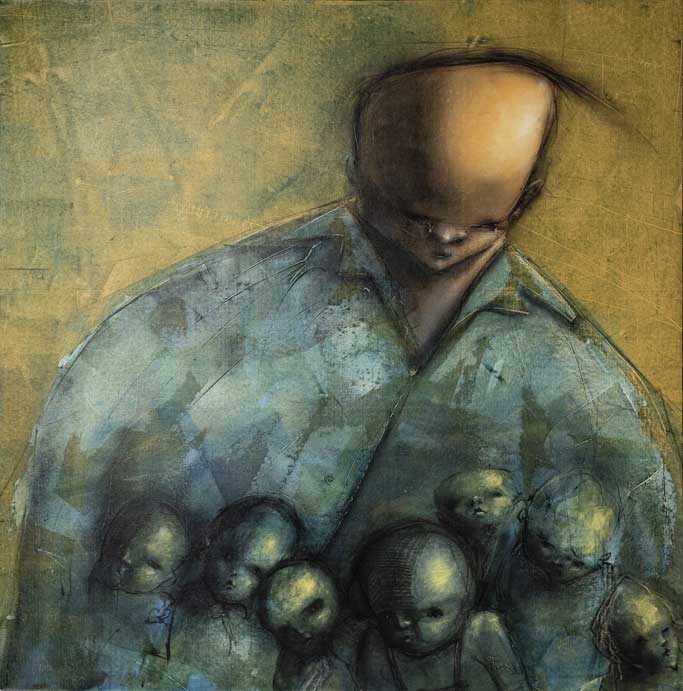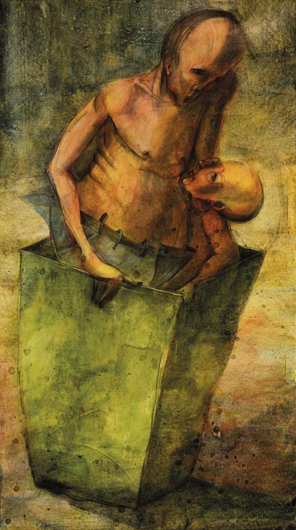 En la obra figurativa de Joel Núñez abundan los espasmos visuales, una sórdida ingenuidad, diagrama de una pesadilla. Son las criaturas que habitan un cuerpo transado por el terror. Me pregunto si generaciones como la nuestra abrigan sentimientos perturbadores, tribulaciones que terminan atormentando la conciencia y haciendo disfuncional un cuerpo. No es gratuita una visualidad como la que Joel Núñez nos ha propuesto durante tantos años. Su sentido del expresionismo lo abarca todo. En cada sujeto alberga un lado mísero, algo que los desfigura y lo hace siniestro, incluso desde su candidez; son complicados fantasmas cartilaginosos, como esas figuras de nudo que Bruno Münsterberg, el enfermero celador de Oskar, anuda con cordeles desechados que inundan su habitación del psiquiátrico.