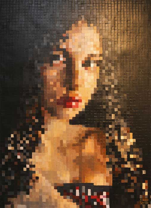 Uno de los retratos realizados por Nadiya Spiller se caracteriza por un efecto de fragmentación que imita el pixelado digital; una metáfora de cómo la imagen titilante de las pantallas suplanta cada día más a las imágenes tradicionales.