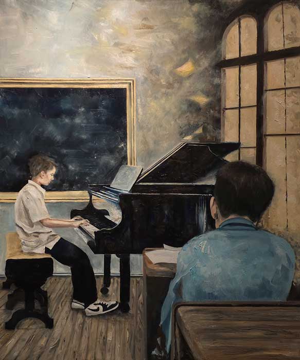El coro representado por Jiyun Cheon, a través de una composición casi piramidal y una gama de tonalidades suaves y delicadas, genera una sensación de seguridad. El coro anula los egos; las personas trabajan en colaboración por un resultado final. La música de Mozart se asocia con el equilibrio, la transparencia y la pureza. Este cuadro se emparenta con esas cualidades. Estamos ante una representación visual del ideal estético clásico: un coro perfecto e intemporal.