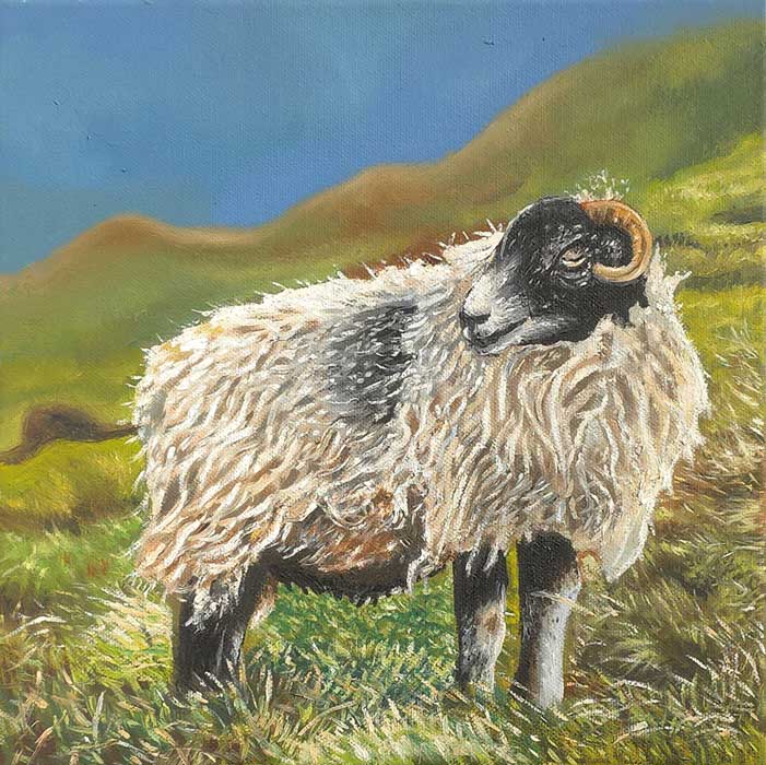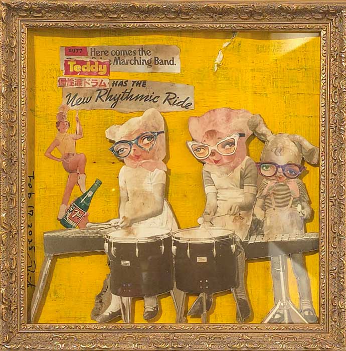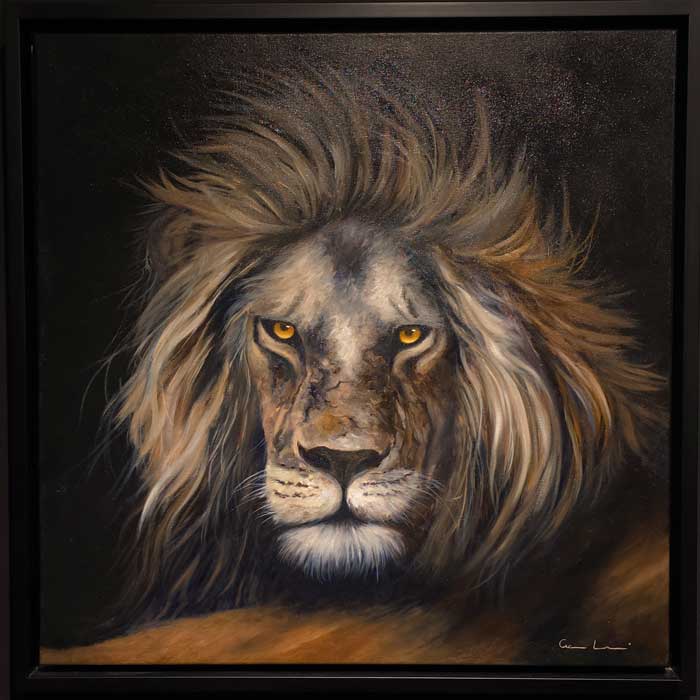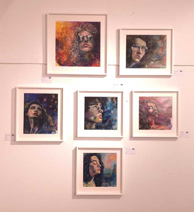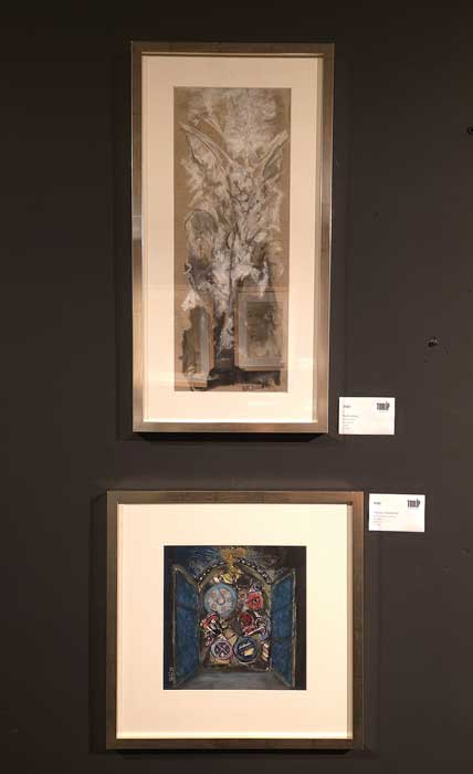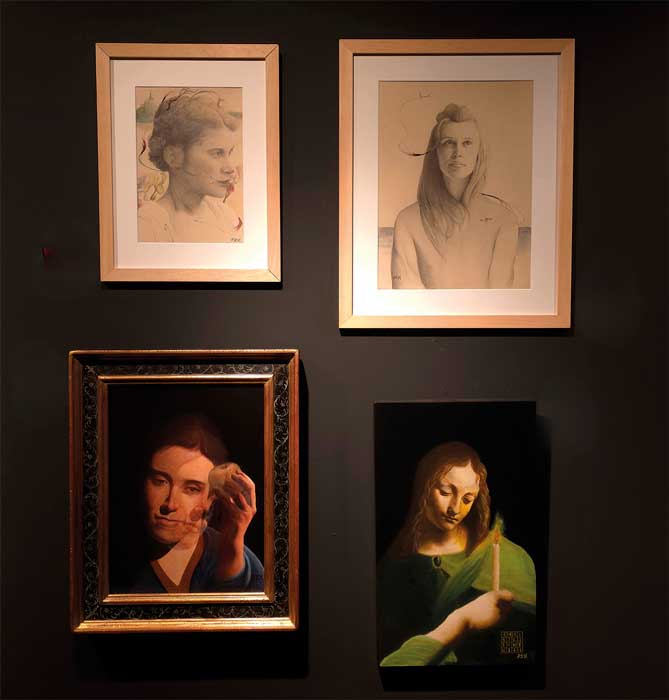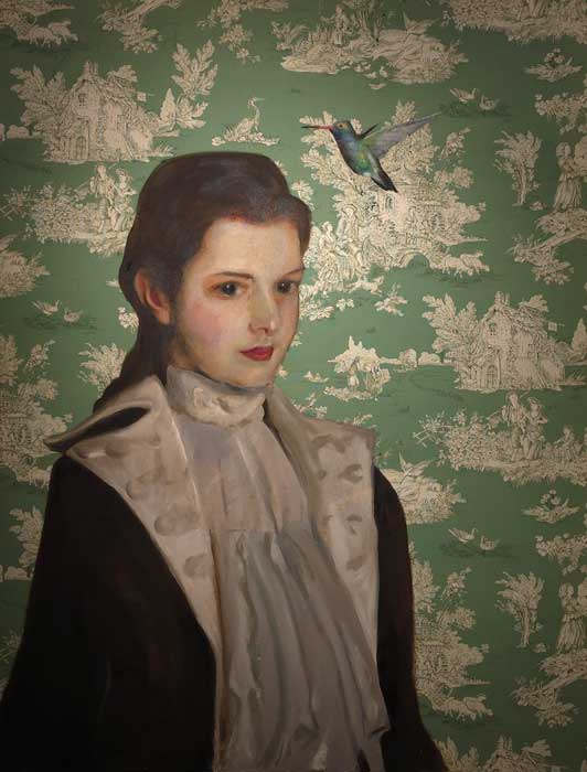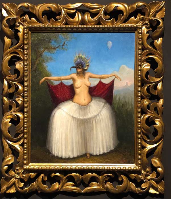 Un cuadro presentado por Matthew James Collins nos traslada al pasado. El marco tiene tanta importancia aquí que lo consideramos parte de la obra. La figura central, al mismo tiempo humana y fantástica, pudiera interpretarse como la protagonista de una ópera. La paleta es audaz y los colores vibran a través de la suavidad de la ejecución y el tratamiento de la luz. La obra parece celebrar la expansión del conocimiento a través de la iluminación haciendo, quizás, un guiño a La flauta mágica.
