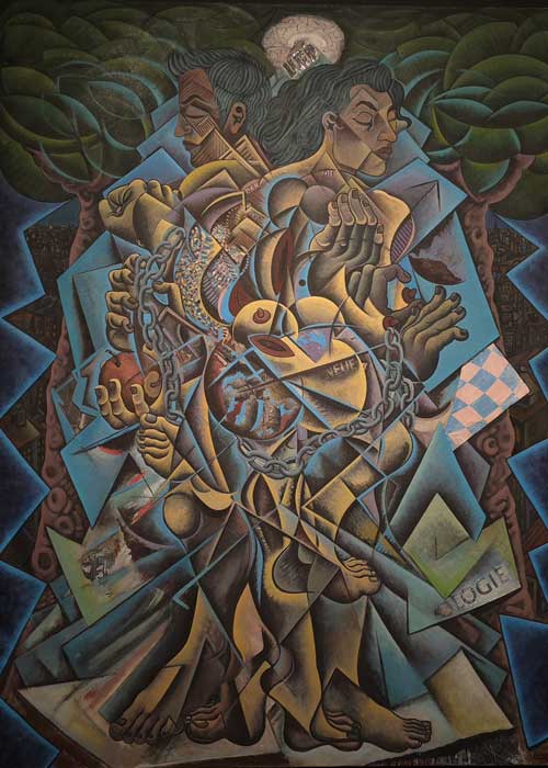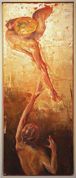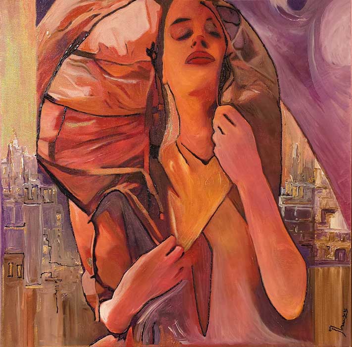 La pincelada de Sergei Komiagin en Mistery, de vibrantes tonalidades rojas, amarillas y naranjas, aporta una enorme energía a esta composición llena de sensualidad y belleza. Los cuerpos se fusionan entre ellos y con el fondo, en una experiencia sensorial colmada de calidez.