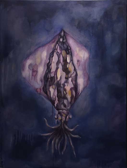 Anna Espona nos trae una forma orgánica envuelta en una atmósfera estable y armónica. La silueta hace pensar en un ser del mar parecido a los cefalópodos. El tratamiento pictórico está basado en transparencias que aportan profundidad.
