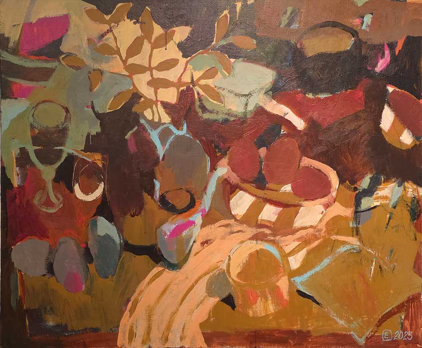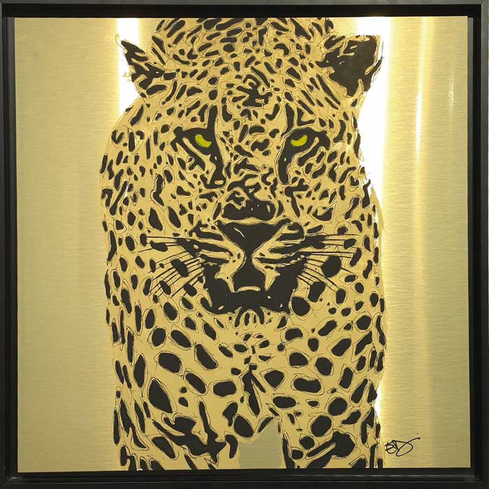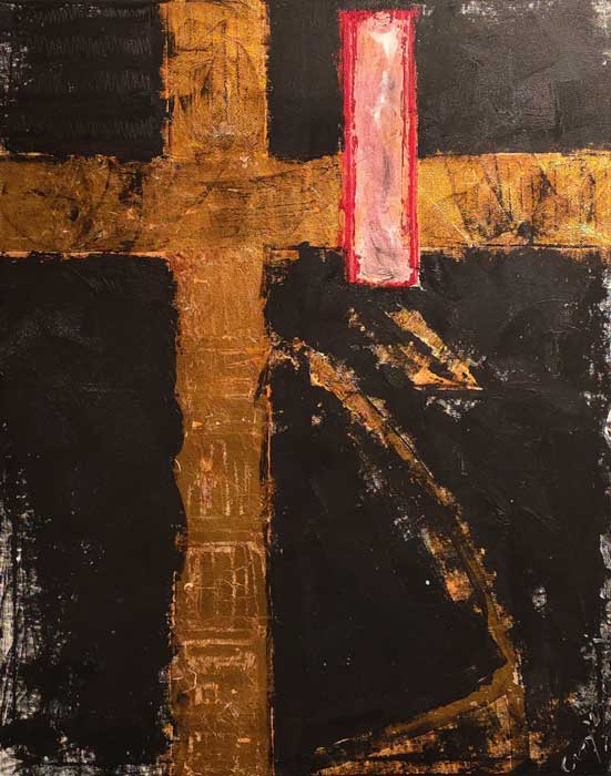 Cassy nos remite al arte matérico y al expresionismo abstracto. Desde un fondo oscuro y denso, emerge una estructura contundente en tonos casi dorados y en forma de cruz. La textura dorada, irregular y casi erosionada produce una tensión entre lo elevado y lo pedestre, entre lo eterno y lo intrascendente.