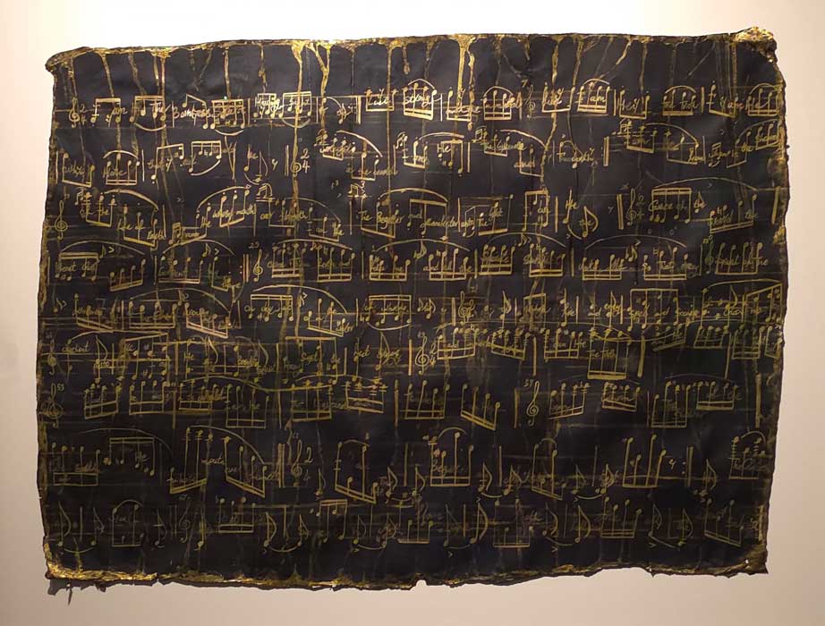 Arman Mansouri explota la partitura —en una de sus obras presentadas—, no solo por su cualidad simbólica, sino por su valor expresivo. El efecto de la trama de líneas doradas contra el fondo negro convierte la partitura en una suerte de jeroglífico, un texto hermético que impulsa al espectador a desentrañarlo.