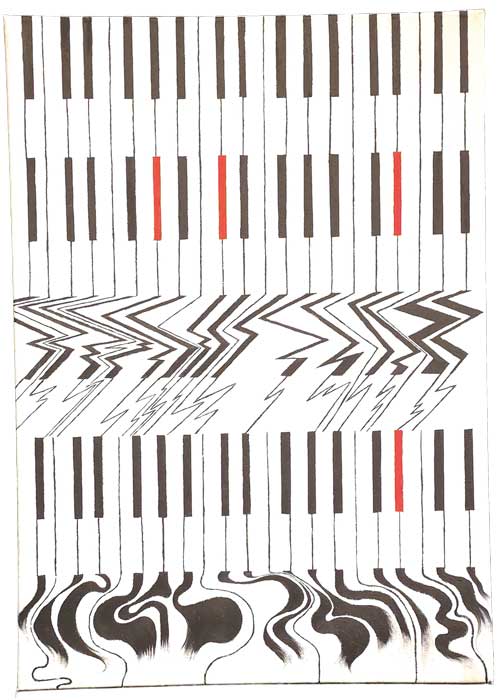 Resulta contundente la pieza titulada Piano, presentada por Enbu Yakami; en ella el orden geométrico del teclado se distorsiona intencionalmente, dinamitando el imponente ritmo de las teclas, aportando vitalidad y movimiento a lo estático, a lo simétrico. La estructura rígida se expande en este significativo y metafórico rompimiento. Se produce aquí una tensión entre la exactitud de las líneas rectas —estructura que encarna el orden clásico— y las ondulaciones y quiebres que nos remiten a las creaciones transgresoras; aquellas que, como la obra de Mozart, revolucionan el mundo superando los esquemas establecidos.