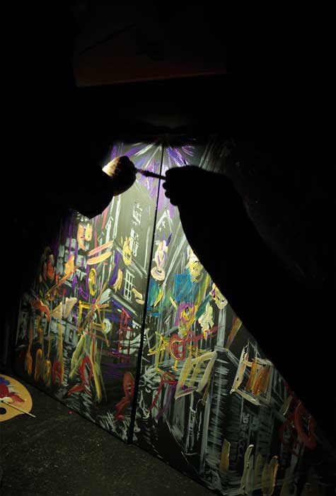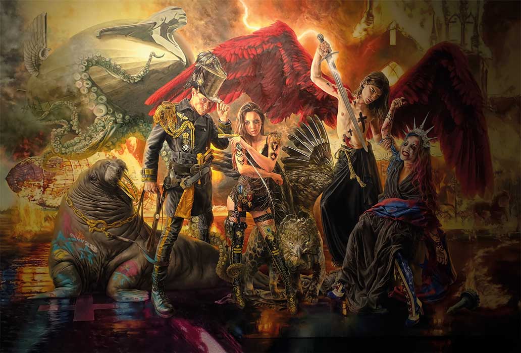 Uno de los cuadros más complejos de la muestra fue presentado por Robert Ricov. Se trata de una obra compuesta por figuras al mismo tiempo épicas y contemporáneas, en medio de un espacio donde reina la destrucción. Se combinan aquí criaturas fantásticas, insignias militares, armas y ornamentos rituales. El uso del claroscuro provoca una densidad que recuerda el período barroco. El cuadro rebasa su condición pictórica a causa de su carácter teatral.