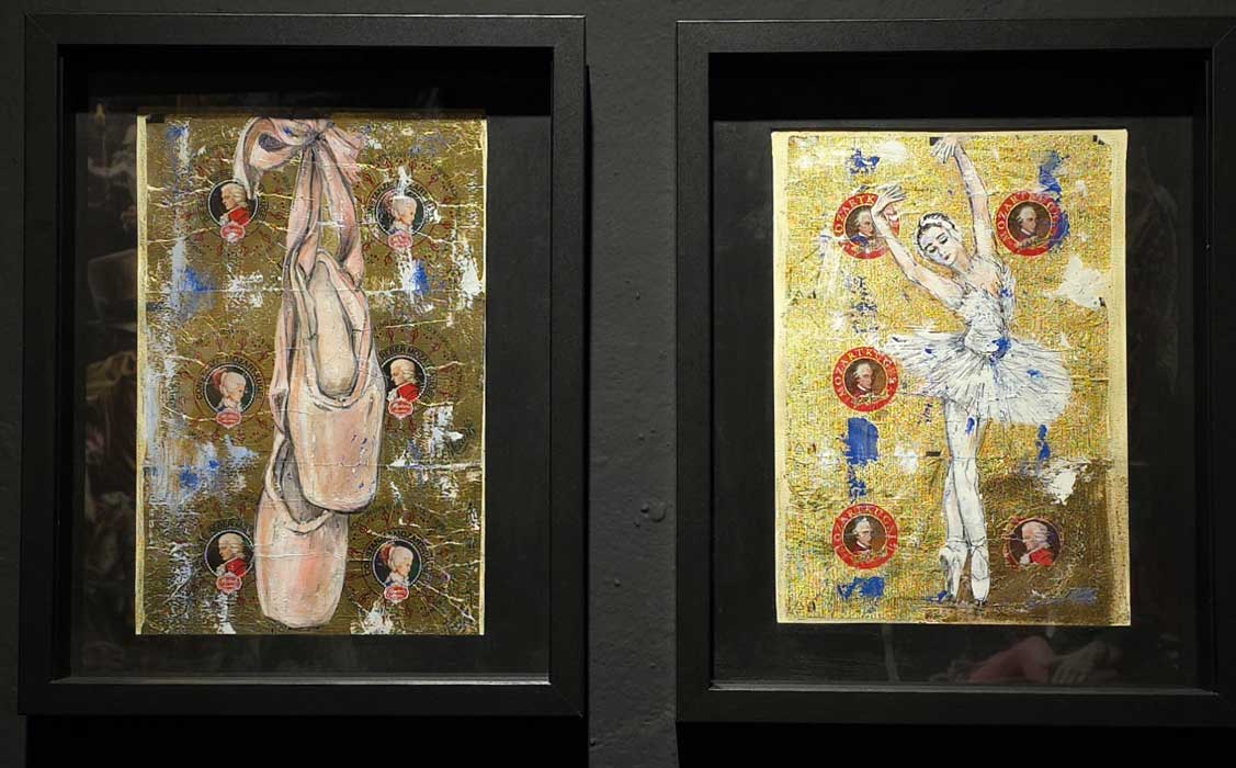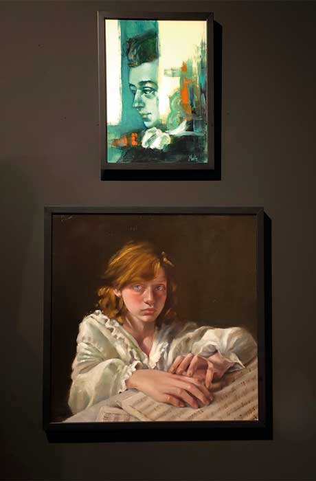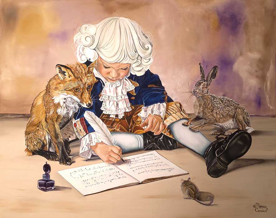 Mónica Conde también retrata a Mozart, pero mucho más pequeño; la manera de resolver la figura se apoya mucho en las líneas, resultando un híbrido entre dibujo y pintura que le aporta un matiz ilustrativo. La delicadeza de la realización y el nivel de detalles con que resuelve las formas nos remite al rococó.