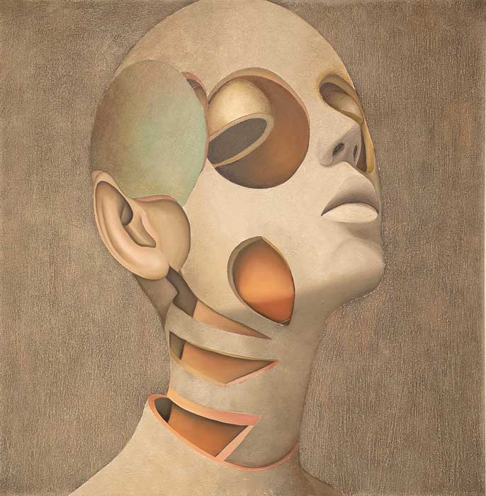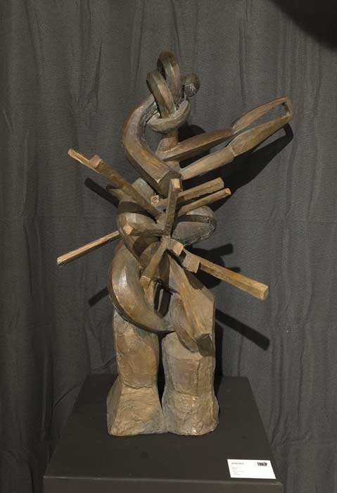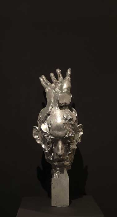 Dionis Solo presenta una escultura muy potente: una cabeza modelada en metal, de superficie rocosa, fracturada; esa textura la hace más expresiva, aportando pasión al rostro. El diálogo que establecen el corazón y la mano nos hace pensar en el vínculo existente entre identidad y creación, sugiriendo que el impulso creativo no nace de la razón solamente, sino de las emociones volcánicas que desbordan al creador.