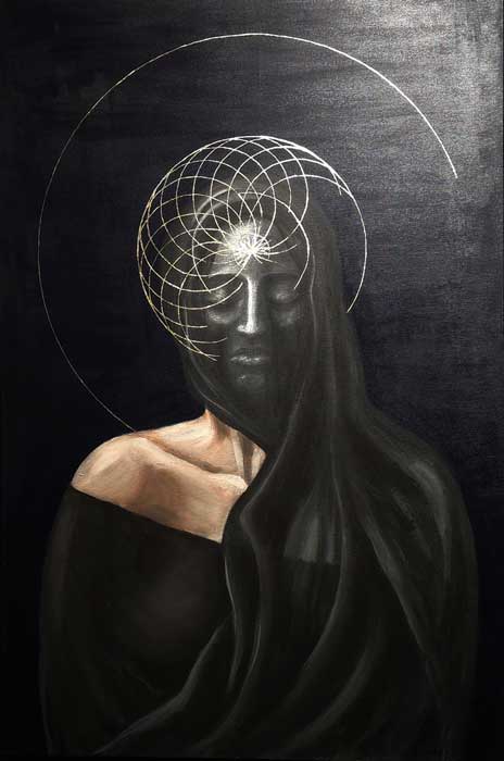 Roxana Ilasoaia nos genera una sensación de misterio a través de una figura humana fusionada con líneas curvas que se entrecruzan. El halo sugiere una conexión trascendental, recordando la iconografía de los santos en las iglesias. Hay aquí un diálogo entre lo humano y lo divino.