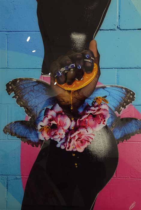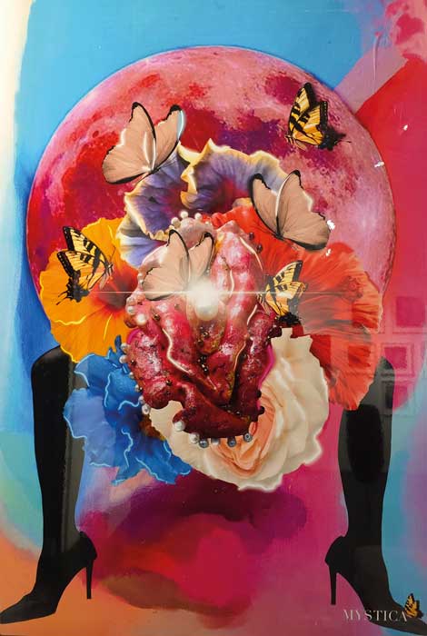 Una de las obras de Mystica the Brave nos muestra un monumental cuerpo femenino fragmentado y atrayente. En el centro, un cinturón orgánico de flores y mariposas fusiona lo instintivo y lo ornamental. La mano representa el gesto más contundente del conjunto, hundiendo los dedos en una fruta con ímpetu pasional, induciendo al espectador a una lectura erótica con gran elegancia formal.