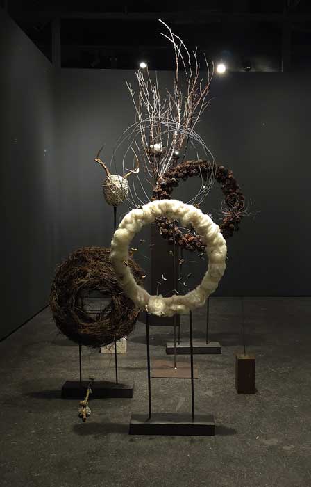 La obra de Marisa Falcone consiste en una instalación construida a partir de materiales orgánicos. Los círculos actúan como núcleos simbólicos que interactúan como si fueran instrumentos en una pieza de jazz. La pieza es austera en el sentido cromático, pero seductora por sus líneas que trazan un dibujo aéreo que parece flotar en el espacio.