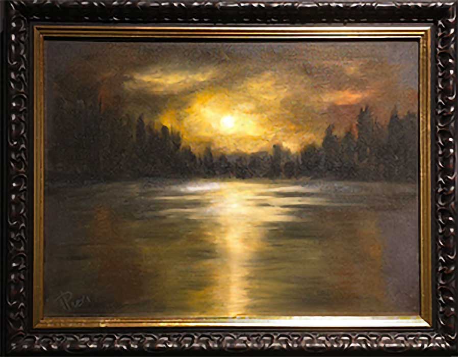 En Hiding Angel, una de las obras presentadas por Tibor Pogonyi, la copa de un árbol parece expandirse en una explosión luminosa. El ángel que asoma en la penumbra, colgado de las ramas, dramatiza la escena. El cielo nos remite al romanticismo; es una escena en la que lo onírico y lo sagrado convergen, no solo por aquello que se representa, sino por el tratamiento mismo de la pincelada, que se despliega vaporosa, entre lo difuso y lo radiante.
