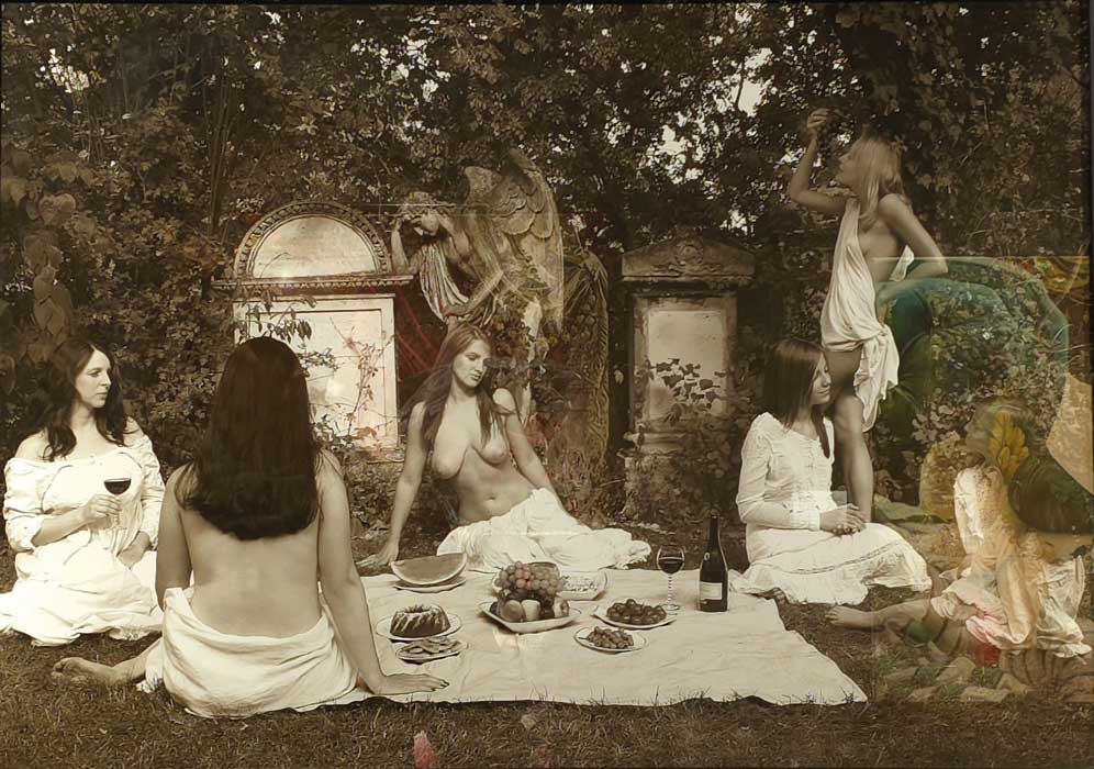 La fotografía Picnic de Elvira Rajek nos remonta a El almuerzo sobre la hierba de Manet. En este caso las figuras desnudas están en un cementerio, en presencia de figuras angelicales que evocan una conexión con lo divino.