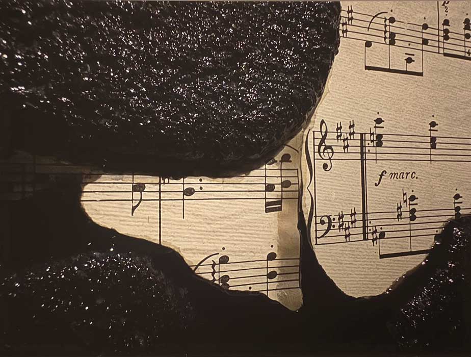 Sari Fishman acude directamente a la partitura, representándola amenazada por una masa de materia oscura que intenta devorarla. Son piezas contundentes, comunicativas y gráficas, en las que los elementos son directos sin ser literales; un ejercicio de arte conceptual, pero con sabor a arte matérico, pues el brillo de la siniestra masa negra tiene una cualidad corpórea y táctil. Es el acecho de la muerte, pero no desde aquella alegoría idealizada con guadaña al hombro, sino de la verdadera muerte, la muerte orgánica, con todo el peso de su materialidad.