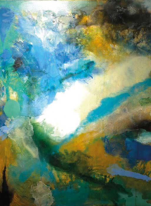 Josep Torelló presenta un cuadro abstracto que posee un vigoroso dinamismo cromático; la luz central funciona como un núcleo generador que expande energía al resto del espacio pictórico. La obra oscila entre lo orgánico y lo onírico, y provoca un enorme placer visual.
