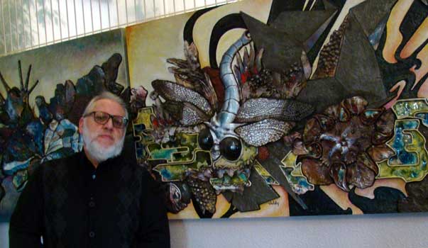 En 2010 retomo mi faceta surrealista. Aplico una técnica propia donde el motivo es realzado por piezas cerámicas engarzadas sobre fondos de tabla, pintados tradicionalmente. Esculto-pinturas las denomino por ser la simbiosis de 2 técnicas.