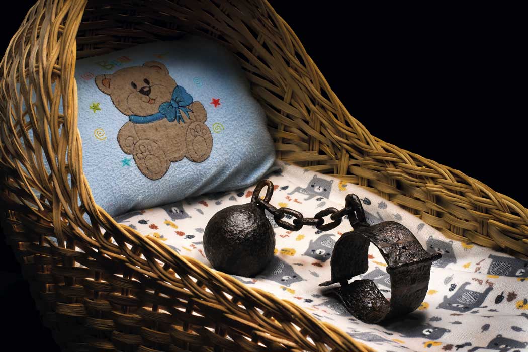 En el caso de Moisés, la oposición entre lo tierno y lo crudo, entre lo suave y lo duro, es el recurso que provoca el impacto. La pieza resulta perturbadora y poderosa conceptualmente: La cuna, asociada al nacimiento, nos remite a la inocencia, pero en lugar de contener un bebé acoge un grillete y una bola de hierro, metáfora de cautiverio. La yuxtaposición entre objetos de significado opuesto despierta, en este caso, una profunda reflexión sobre los condicionamientos que impone la sociedad al individuo desde sus primeros días de vida. Se produce aquí una tensión simbólica entre los elementos que componen la imagen. El Teddy Bear, bordado en la funda de la almohada, se vincula aquí con una tradición iconográfica en la que lo infantil funciona como soporte simbólico de la vulnerabilidad.