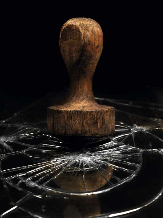 Hay otra obra de Delfino que no necesita título, pues resulta muy directa y su discurso es contundente; la sobriedad y el dramatismo de la composición así lo atestiguan. El fondo oscuro aísla la figura protagónica del cuño, potenciando su carácter escultórico, mientras que la luz incide sobre su superficie revelando lo rugoso de la madera, que contrasta con la fragilidad del cristal roto. Este contraste de texturas entre lo áspero y lo quebrado acentúa una oposición conceptual entre la norma rígida y la fractura social que esta genera.