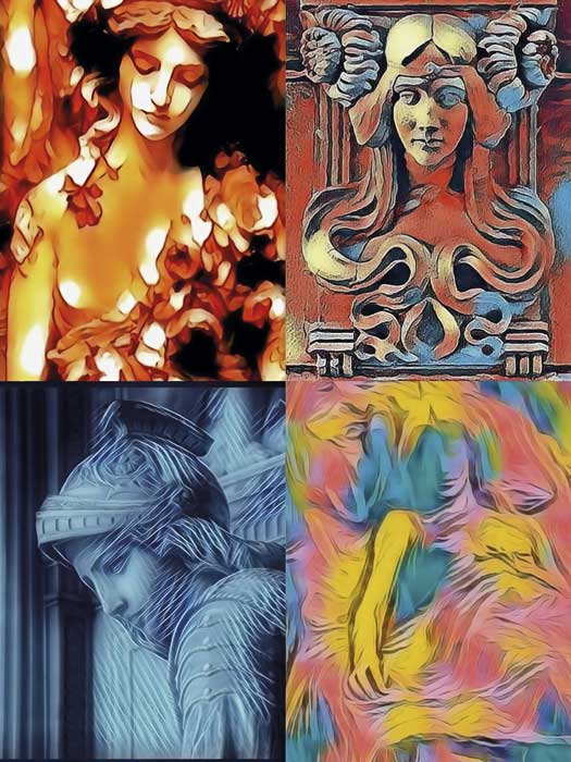 Se vale el artista de resonancias líricas y texturas que recuerdan el Romanticismo en la primera figura a la izquierda, en contraste con la de la derecha, resuelta con un carácter ornamental que se acerca al Art Nouveau; debajo y a la izquierda, la figura azul se muestra más clásica, un tanto fúnebre, como una elegía en tonalidad menor, mientras que en el último cuadrante elige un camino expresivo sinuoso, envolvente y profundamente emocional, sugiriendo, como en una pieza de jazz, la disolución de la forma y la irrupción de lo contemporáneo.