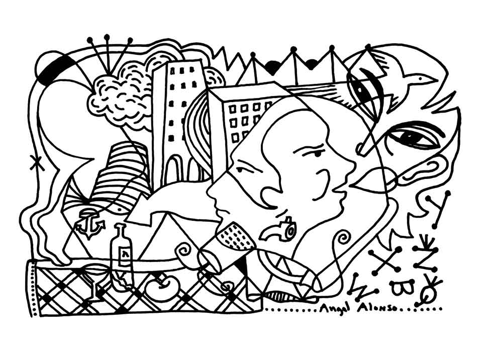 El dibujo contiene una vibración sensorial que se siente también como sonido, la utilización de espacios vacíos dentro del aparente barroquismo genera una especie de silencio similar a la pausa en la música, esos momentos de quietud que intensifican la energía en el siguiente instante. Los edificios se mezclan con elementos abstractos y la naturaleza muerta que incluye (botellas, manteles, frutas) nos remite al ambiente de los bares en los que se desarrolló el feeling, un estilo cubano que surgió a finales de la década de 1940 y que exalta los sentimientos a través de las sonoridades del bolero y del jazz.