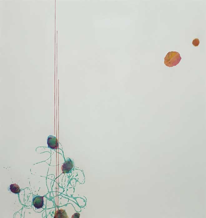El espacio blanco no funciona aquí como vacío, sino como pausa, un silencio cargado de tensión, comparable al rest de las notaciones musicales. Se trata de un campo de contención amplio, del que surgen intervenciones plásticas como si fuesen acentos tímbricos. Las líneas rojas verticales, finas y firmes, funcionan como compases de un instrumento, cuerdas tensas sobre las cuales los demás elementos gravitan. Dos manchas circulares en la parte superior derecha actúan como armónicos suspendidos, balanceando la composición, equilibrando el peso de las manchas verdes y oscuras que aparecen en la parte inferior izquierda.