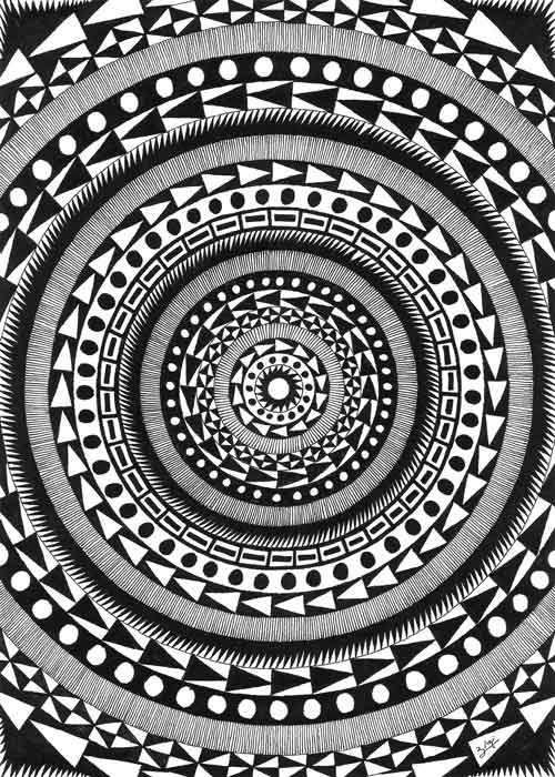 En esta pieza, la estructura en espiral genera una sensación de movimiento continuo, similar al ritmo que encontramos en una pieza musical. La repetición de formas geométricas, como triángulos, círculos y líneas, crea una cadencia que remite a las pulsaciones o los compases musicales; el ojo recorre la obra siguiendo un patrón predecible y fluido, similar a cómo un oyente experimentaría una pieza de música que alterna entre reiteraciones y variaciones. Los círculos y las bandas de triángulos poseen una equivalencia rítmica, tanto por su repetición como por la manera en que las formas cambian ligeramente a medida que se van alejando del centro.