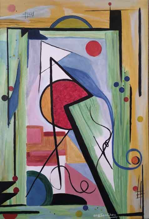 En esta obra de Eva Sánchez, los vínculos entre las artes plásticas y la música se manifiestan mediante una estructuración visual compleja, la pieza establece una partitura cromática donde lo geométrico y el uso de líneas sinuosas edifican un espacio sonoro a través del plano pictórico. Forma, color y movimiento, interactúan generando un ritmo visual que evoca la estructura de una composición contemporánea atrevida y atonal.