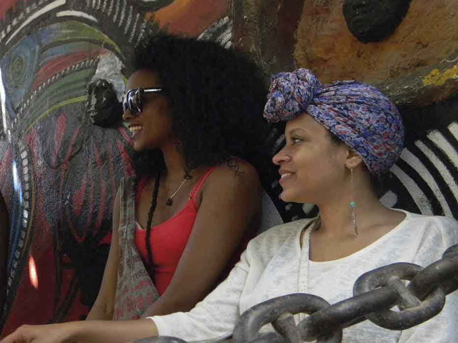 Esta fotografía de Pau Mar, tomada en el Callejón de Hamel, capta a dos mujeres en actitud distendida, el verdadero contenido queda fuera de cámara, porque está en lo que ellas miran. El Callejón de Hamel es conocido por las celebraciones de bailes afrocubanos. En ese enclave hay arte mural, escultura reciclada… todo en ese sitio, fundado por el pintor Salvador González Escalona —ya desaparecido— se caracteriza por la influencia del sincretismo de las religiones afrocaribeñas.