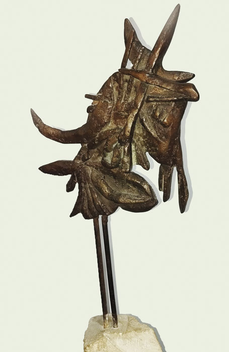 Esta pieza construye un puente conceptual con el imaginario metalero al invocar formas que podrían leerse como espinas, componentes de una máscara ritual con carácter de criatura postapocalíptica. Hay aquí un uso expresionista del bronce, esto evoca el peso emocional y existencial de esta música en la que el dolor, la melancolía y lo ancestral son tópicos recurrentes. Suspendida entre lo terrenal y lo cósmico, La Pell de la Lluna enarbola un grito silencioso, una resistencia interior que se solidifica en materia. Puig Volart crea, más allá de una escultura, una resonancia visual, un rito metalero caracterizado por el desgarro y la autenticidad. ■