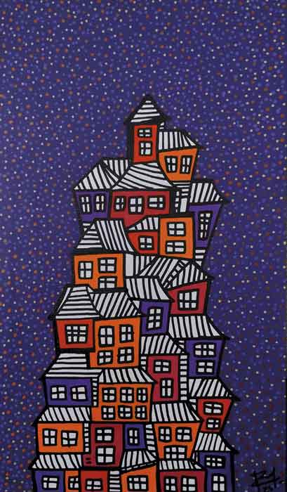 A través de sus colores vibrantes y una estructura compositiva dinámica, Rafael propone una reflexión sobre la interacción entre la música y la pintura. Su intensa paleta cromática evoca tanto la armonía como el contraste: las tonalidades naranjas y violetas crean una sensación de tensión visual que asociamos con un ritmo pulsante. Las casas, ordenadas en forma de montaña, poseen cadencia irregular, algo que establece un paralelo con la improvisación en el jazz, donde la estructura básica se trastoca y re-configura de manera inesperada y a la vez coherente. Se trata aquí de un jazz latino, fuerte, estridente.
