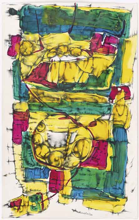 Existe un balance entre lo gestual y lo geométrico, este equilibrio alude a la dualidad existente entre lo rígido y lo libre, y encuentra un reflejo en el mundo de la música, si pensamos en una línea melódica libre que contrasta con acordes rítmicos o motivos repetitivos. En esta obra los sentidos se funden y la mirada se convierte en oído.