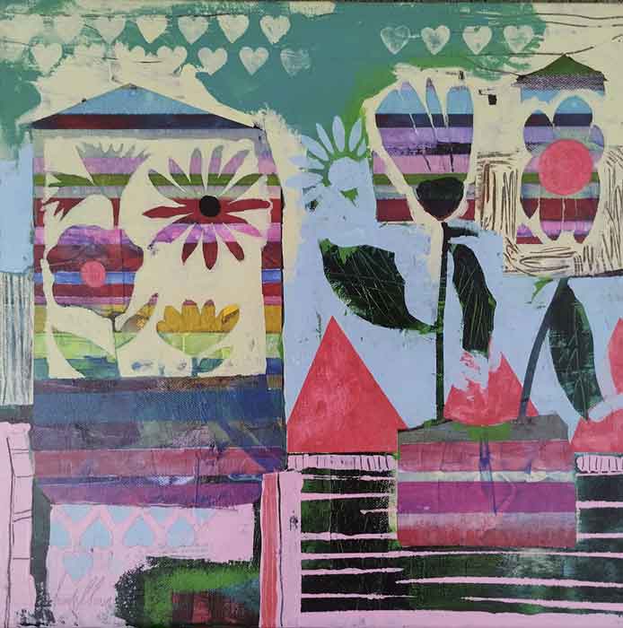 La composición está estructurada como una partitura visual: líneas verticales y horizontales, formas que se repiten, emulan compases y notas que crean una armonía. Flores, casas, corazones… funcionan como variaciones de un mismo tema, tal como ocurre en el terreno musical. Este enfoque encuentra ecos en la obra de Paul Klee, artista que a menudo concebía sus pinturas como composiciones musicales y lograba encarnar un ritmo interno que trascendía lo figurativo. Aquí se establece un lenguaje visual que se desplaza entre lo abstracto y lo figurativo, edificando una narrativa basada en lo sensorial y transmitiendo al espectador la emoción de una melodía alegre.