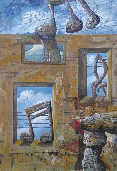 Estas formas remiten al lenguaje abstracto de la música; han sido pintadas como si estuvieran esculpidas; el tipo de textura utilizada y el volumen les hacen parecer fosilizadas en el tiempo. Se trata de un muro erosionado. ¿La materialidad del tiempo, acaso la memoria? El cielo, donde flota el pentagrama etéreo, se convierte en el espacio donde la música se libera del peso físico del mundo.